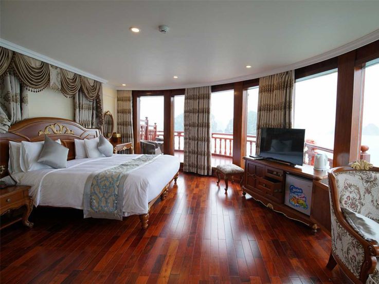 Emperor Cruises offers 02 Signature Suites on the main deck: Do Son Suite and Lak Lake Suite. Both of these suites are spacious with their private balcony offering spectacular sea views. The room size is 43 sqm and includes twin beds or double beds for couples and families. The suites are decorated in Indochine style with wooden floors and fully-equipped furniture. Besides, the bathroom fits for royalty with shower and jacuzzi bathtub. When you are relaxing in the bathtub, the ocean views of the bay can be seen from the window of the bathroom.