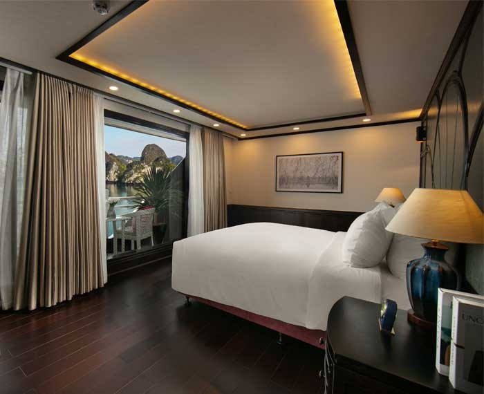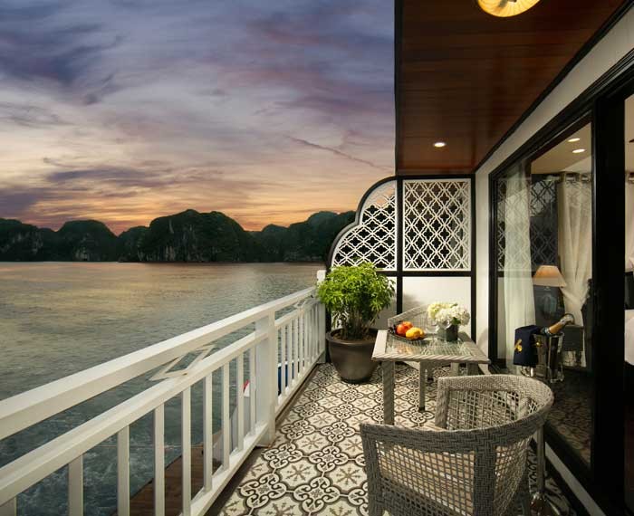 Senior Suite will show you the exquisite view of Halong Bay thanks to its location on the 2nd deck. The suite is fully equipped with many luxurious amenities, including a high-class jacuzzi, lounge chairs, and a large private balcony of 7m2.