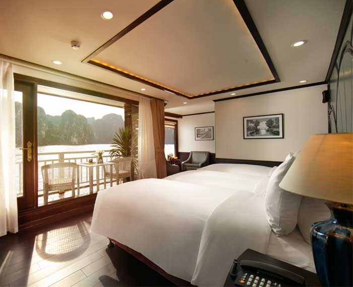 With exquisite design, full of luxury accessories, a private balcony area with comfortable lounge chairs, a high-class jacuzzi bathtub, and other amenities, the Royal Suite room will give you the perfect resting space, and allow you to enjoy the beautiful scenery of Halong Bay.